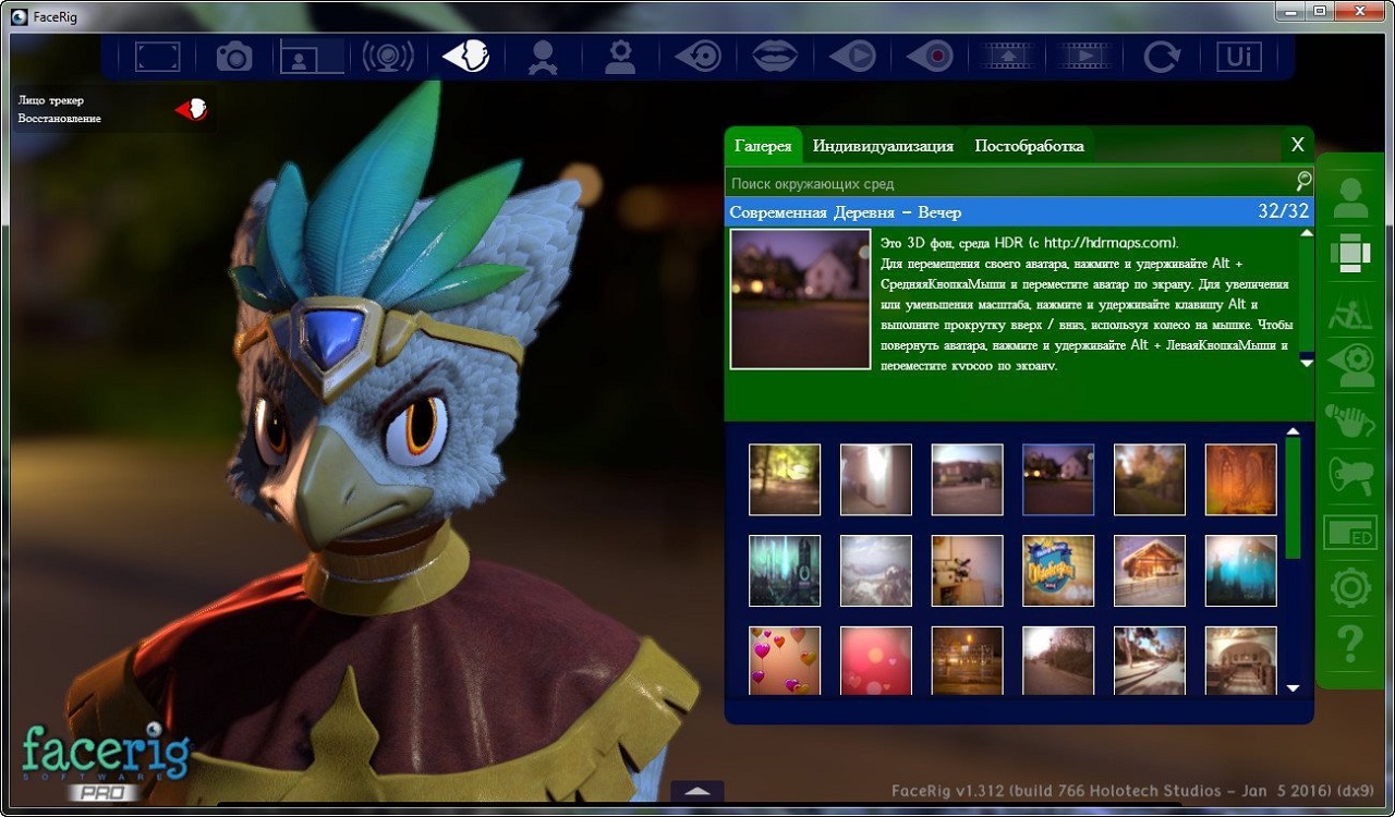 Это краткий список всего того, что можно делать с программой, на самом деле она может служить не только для развлечения, она также может быть полезна при разработке игр или программ, где требуются движущиеся визуальные модели. На данный момент в Facerig Pro всего четыре фона и четыре персонажа на выбор.