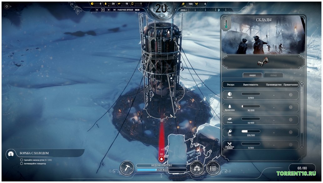 Сам процесс игры выглядит довольно интересным. Поскольку данная русскоязычная версия представляет собой жанр стратегии, вы должны взвешенно подходить к каждому игровому уровню. В условиях мороза, холода и льдов, вы должны построить целый город, чтобы оставшееся население смогло успешно сосуществовать в таких условиях. В игре Frostpunk, скачать торрент на русском которой вы можете легко и просто, посетив наш портал игр, вам придётся заботиться о вашем населении. И главное – это постоянная модификация генератора тепла.