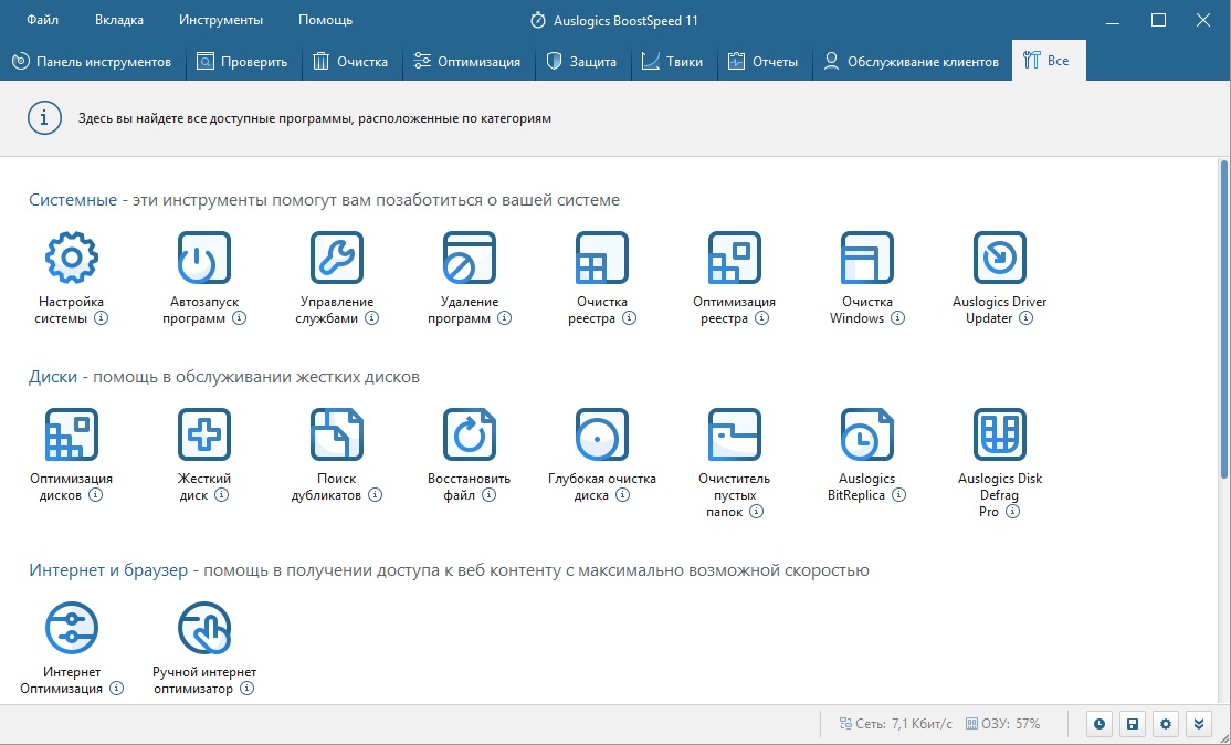 С новой версией софта в него вошло несколько программ, которые позволяют оптимизировать и настроить компьютер на нужный лад. BootSpeed таит в себе еще несколько приложений, без которых сделать это было бы невозможно. Их нельзя установить по отдельности, только комплексно. Также, ими нельзя пользоваться отдельно, лишь вместе с AusLogics. С их помощью пользователям предоставляется возможность оптимизировать все системные процессы, очищать реестры, настраивать автозагрузки и разбираться со свободным местом на диске. Обычно работа программы делится на 3 шага: Сканирования системы - Результаты - Исправление недочетов (если они присутствуют). Есть как автоматическая помощь, так и устранение неполадок вручную. Вы можете задать "Советнику" определенные параметры и он автоматически устранит любые неполадки. Вкладка "Ресурсы" позволяет увидеть все проблемные места, нагрузки на аппаратную часть во всех подробностях. Раздел "Инструменты" содержит всевозможные пресеты, помогающие разобраться с проблемами ПК.